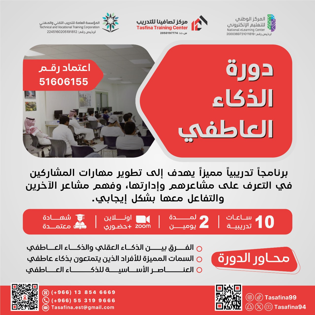 تعد دورة "الذكاء العاطفي" برنامجاً تدريبياً مميزاً يهدف إلى تطوير مهارات المشاركين في التعرف على مشاعرهم وإدارتها، وفهم مشاعر الآخرين والتفاعل معها بشكل إيجابي. خلال هذه الدورة، سيتعلم المشاركون المفاهيم الأساسية للذكاء العاطفي، الذي يعتبر من العوامل الرئيسية لنجاح الأفراد في بيئات العمل والعلاقات الشخصية. يتناول البرنامج التدريبي أجوانب رئيسية في الذكاء الانفعالي: الوعي الذاتي، إدارة الانفعالات ,التعاطف ، الوعي الاجتماعي، وإدارة العلاقات.