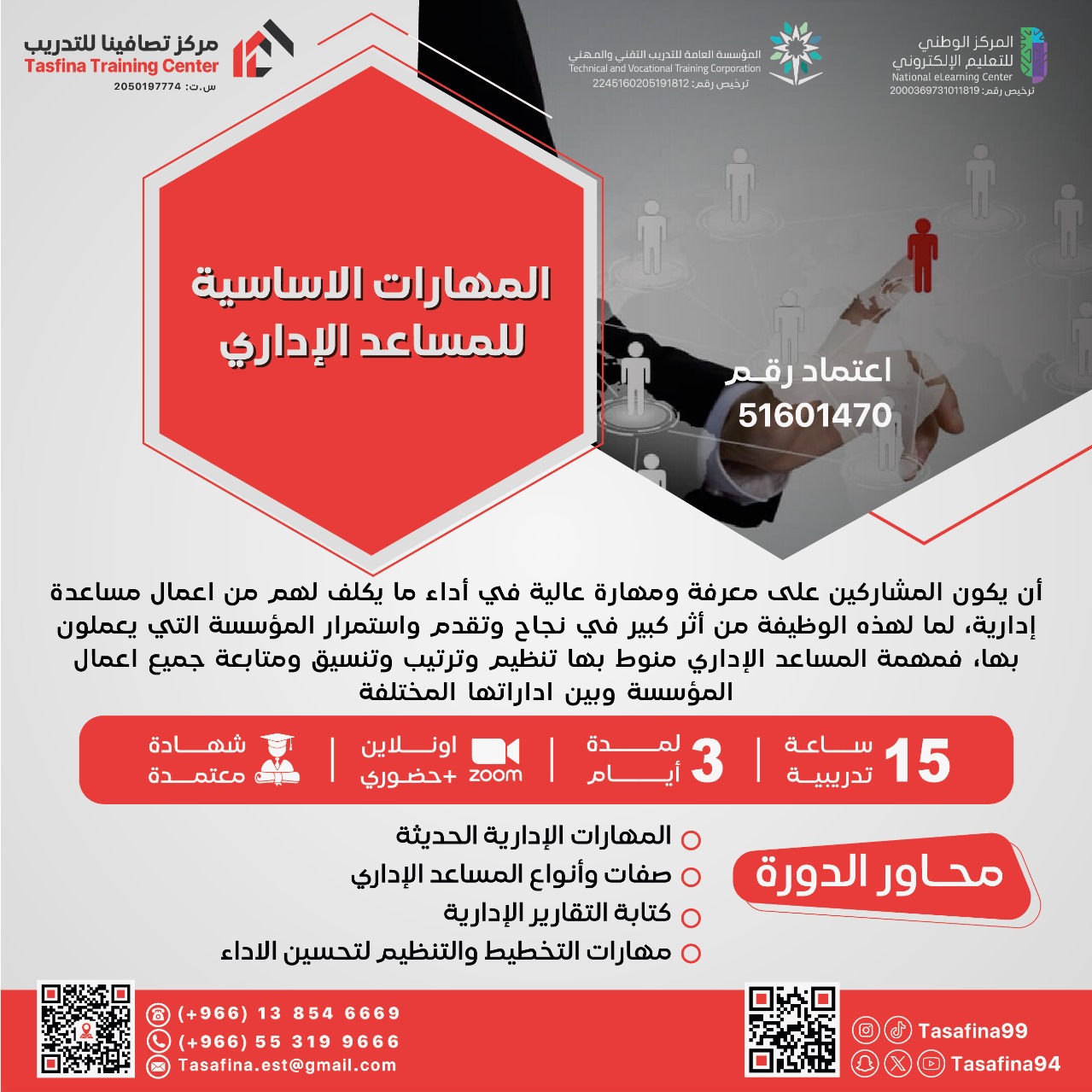 أن يكون المشاركين علي معرفة ومهارة عالية في أداء ما يكلف لهم من اعمال مساعدة إدارية، لما لهذه الوظيفة من اثر كبير في نجاح وتقدم واستمرار المؤسسة التي يعملون بها، فمهمة المساعد الإداري منوط بها تنظيم وترتيب وتنسيق ومتابعة جميع اعمال المؤسسة وبين اداراتها المختلفة.